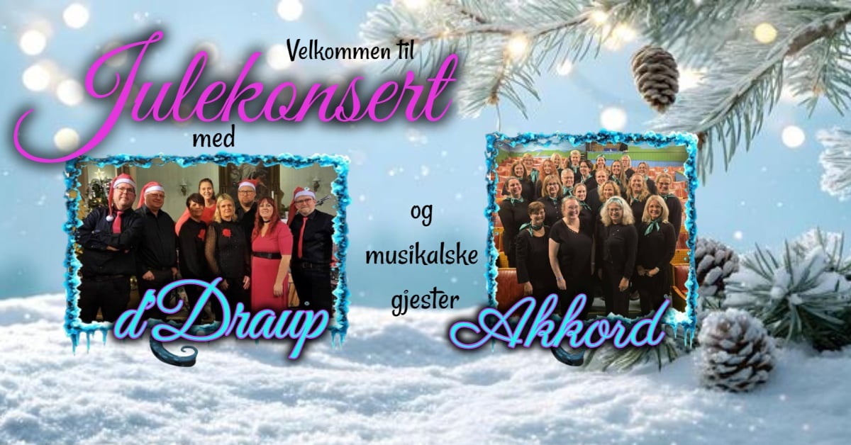 Det er en glede å igjen ønske velkommen til julekonsert med d’Draup i Tokestua. I år er vi så heldig at vi har med oss det fantastiske koret Akkord som våre musikalske gjester. Vi serverer både tradisjonelle kjente julesanger og julesanger som kanskje ikke alle har hørt før, i tillegg til våre egne hjemmesnekra juleviser. Som alltid garanterer vi julestemning, og sammen med Akkord så går vi så langt at vi garanterer høy gåsehudfaktor. Velkommen til julekonsert i Tokestua!!